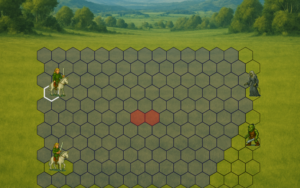Controls: click on a hex to move. To attack, click on a hex occupied by an enemy unit—available attack positions will be highlighted, then select one of them. For units occupying two hexes, certain tiles are split into halves to allow choosing between two attack options. On mobile devices, movement requires a second tap on the same hex to confirm the action.